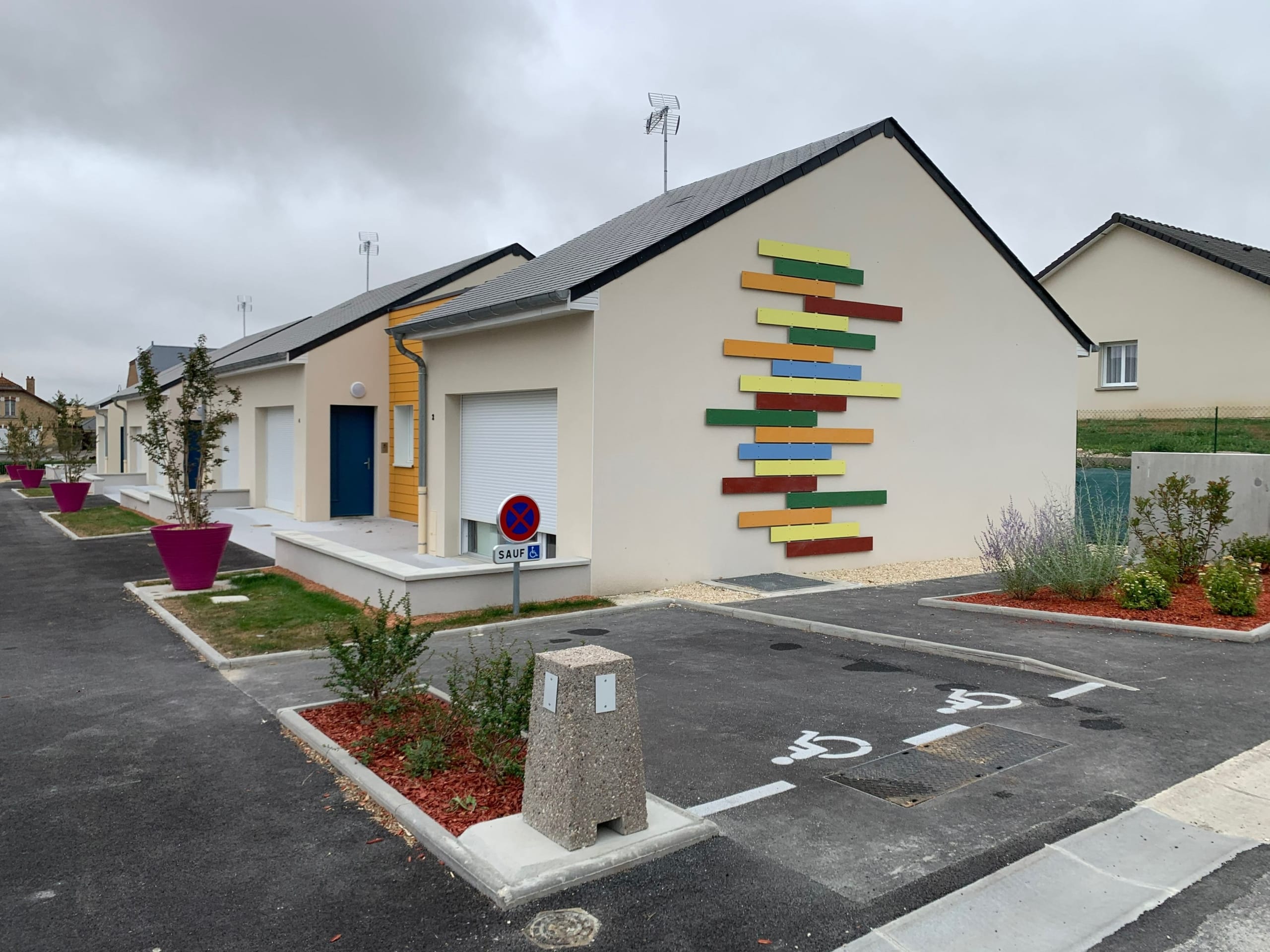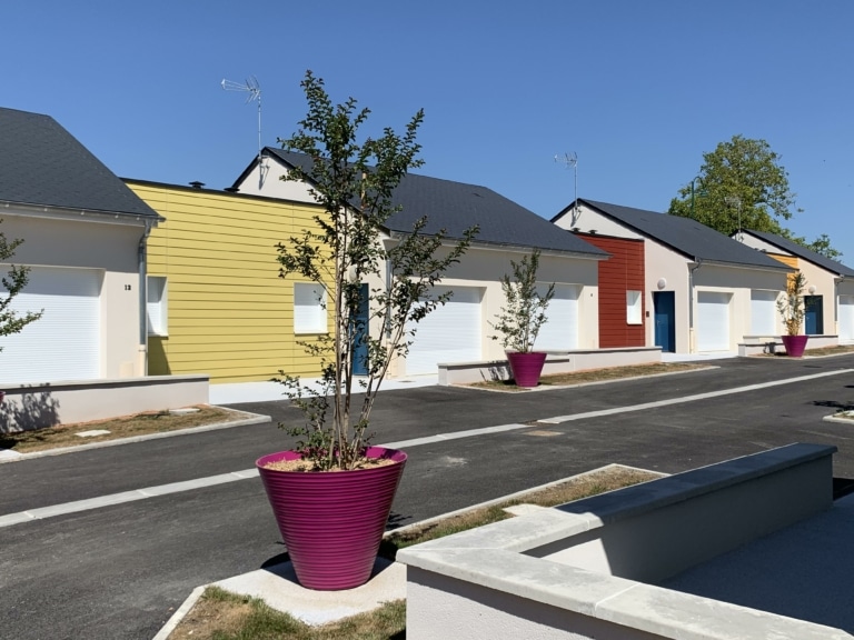Ce projet d’une superficie de terrain totale d’environ 2 742m², concerne la construction de 12 maisons individuelles de type T2, destinées aux personnes âgées. Dans l’objectif de limiter les déperditions thermiques, le choix a été de créer des maisons mitoyennes, chacune constituée d’un salon-séjour, d’une cuisine, d’une salle de bain ainsi que d’une chambre. Chaque habitation dispose de sa propre terrasse délimitée par un muret pour favoriser l’intimité.