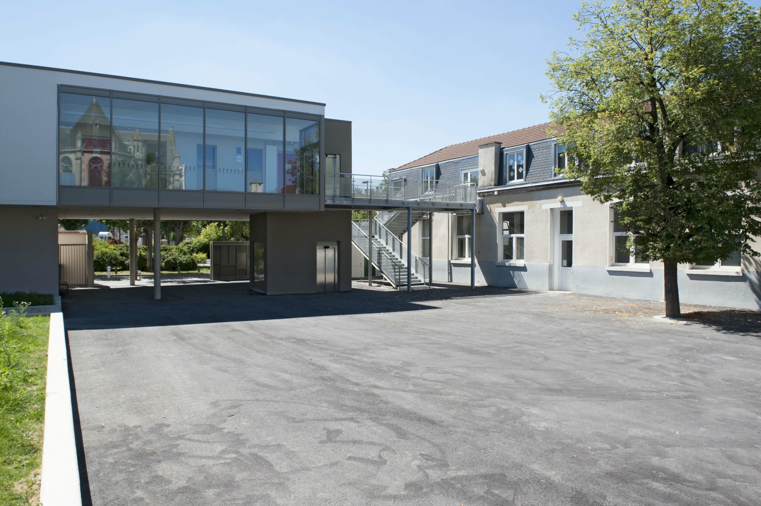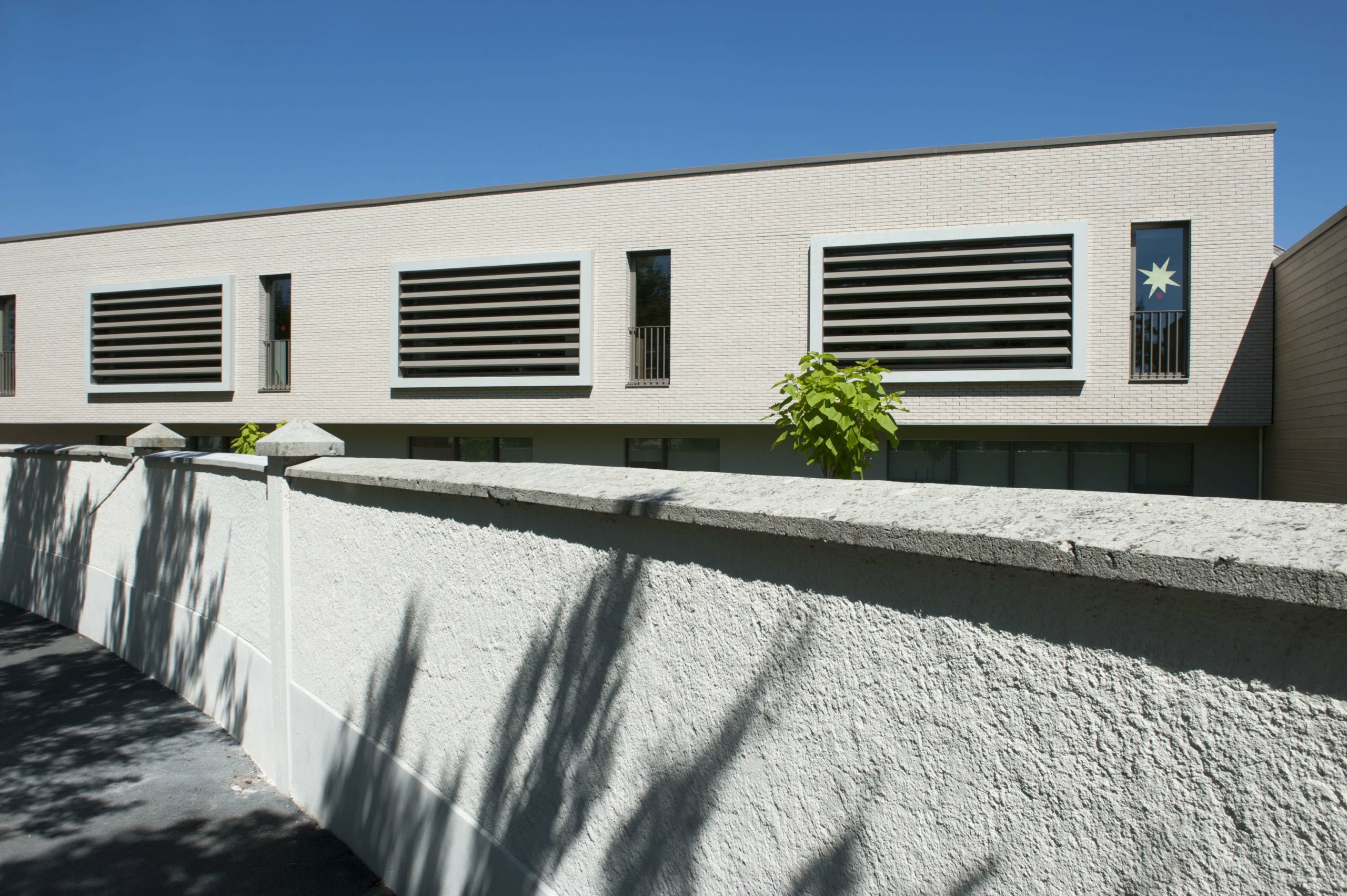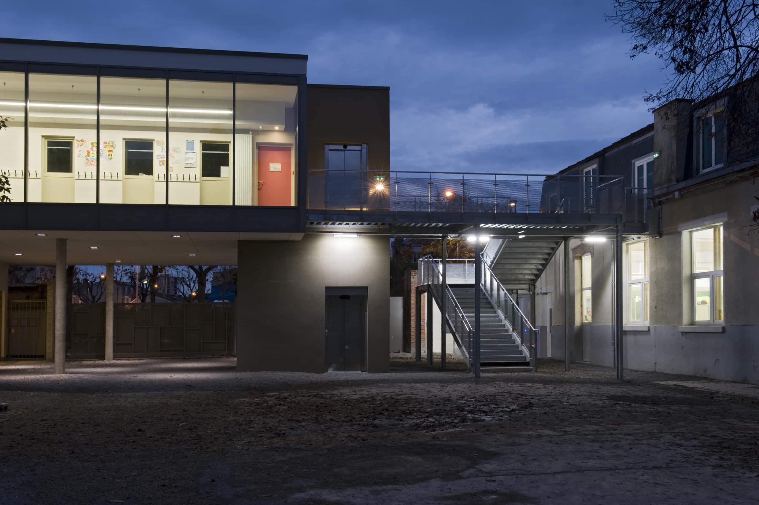 Ce nouveau bâtiment permet d’offrir un total de 12 classes sur l’ensemble du projet, avec de larges baies vitrées donnant sur la place Nicolas Bergier. Il accueille ainsi 5 salles de classe de maternelle, 3 salles de classe de primaire et 4 autres salles dans le bâtiment principal.