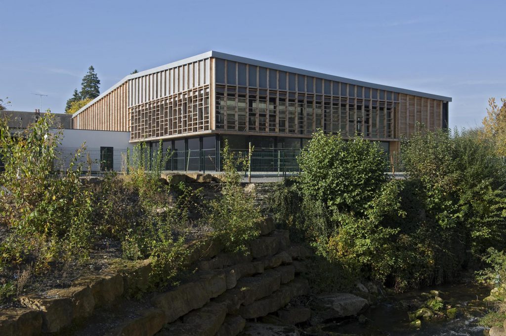 Construite en cœur de ville, face à un espace paysagé, la Salle polyvalente de Signy l’Abbaye fait repère par son échelle, sa forme simple et son enveloppe de béton, de verre et de bois.